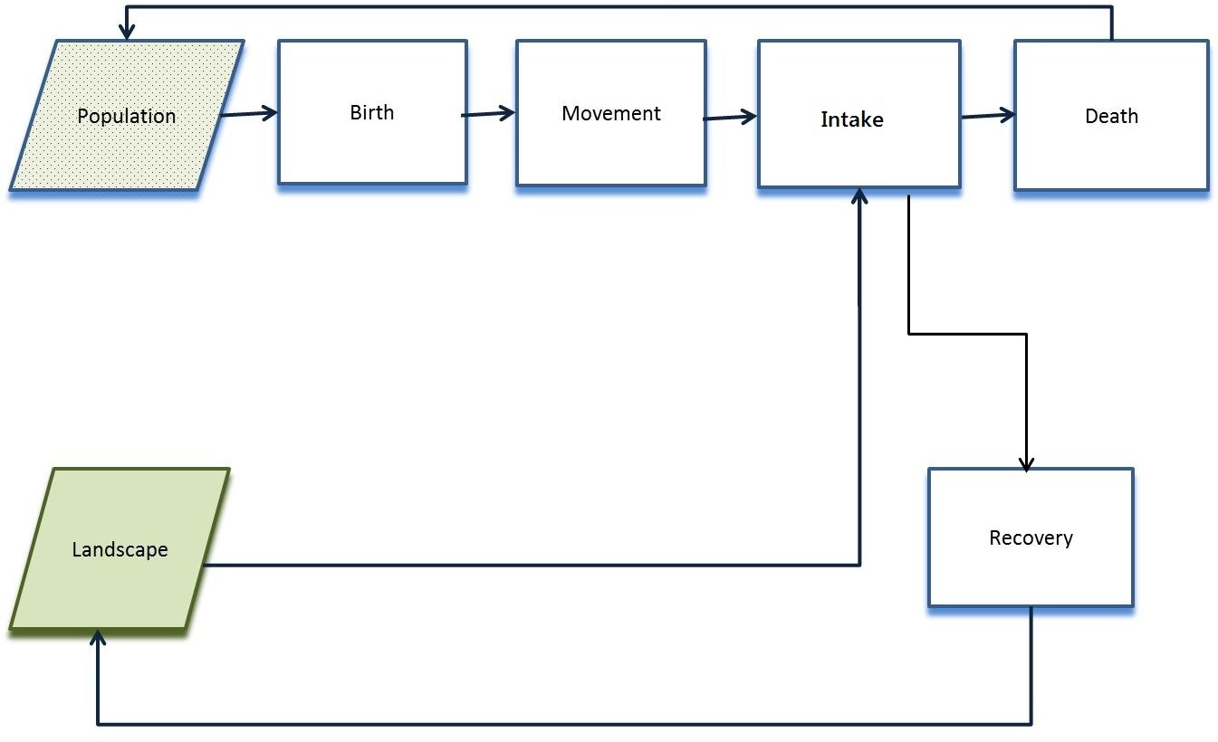 The level of stock of landscape resources influences the birth process as well as the size of the rabbit population. The number of agents also influences directly the total consumption of the resources. Decrease in population is a function of the individual ages and stock of calories.