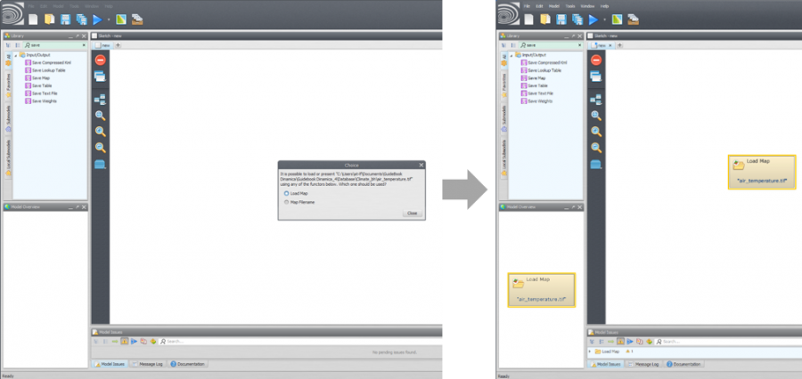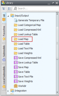 There are two ways to load a raster file into Dinamica EGO. The first is through the functor Load Map. To do so, click on the Input/Output tab from the Library window, drag a Load Map and place it on the sketch: