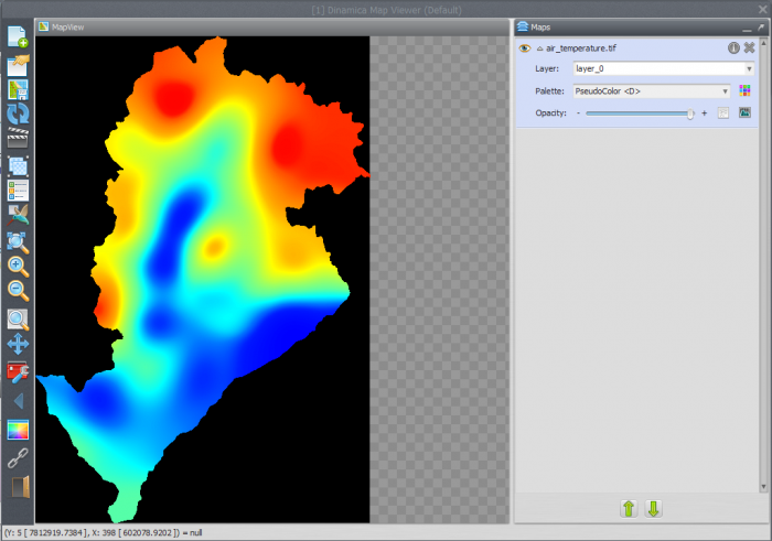 To view the loaded map, double click on your Load Map functor and then click on the eye button. The map will be opened in Dinamica Map Viewer. Click on the down arrow next to the map name on the map list inside of the map viewer, then click on the Histogram icon to adjust the visualization of the map. Select “Limits to Actual” inside the “Limits” options and then choose one of the transformations options. The following image depicts a map with an “Equalize” transformation: