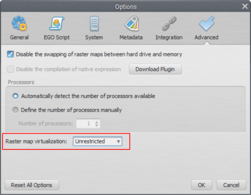 The virtualization process is mostly automatic and happens by simply passing maps with different extents and resolutions to any functor. However, the user can limit the virtualzation process by checking the options available on “Tools → Options | Advanced | Virtualization”. Basically, the user can choose one of the following options.